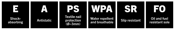 Predná časť topánky sa pružne ohýba s chodidlom. Zvršok z odolnej tkaniny. Otvára sa a zapína pomocou systému BOA® Fit, ktorý sa skladá z otočného kolieska, šnúrky a vodítok. Päta je z vnútornej strany podšitá pamäťovou penou. Kompozitná špička. Textilná ochrana nechtov. Ochrana proti prepichnutiu tkaniny MASCOLAYER®. Mäkká a pružná stielka tlmiaca nárazy. Vložky sú odnímateľné. Medzipodrážka z eTPU a EVA. Integrovaná karbónová doska v medzipodrážke pre zvýšenú návratnosť energie. TPU vystuženie päty. Vystuženie špičky z TPU. Gumená vonkajšia podrážka s 3D tlačeným vzorom. Podrážka je odolná voči olejom a benzínu. ESD schválené podľa EN IEC 61340-4-3: 2018, EN 61340-5-1: 2016.
