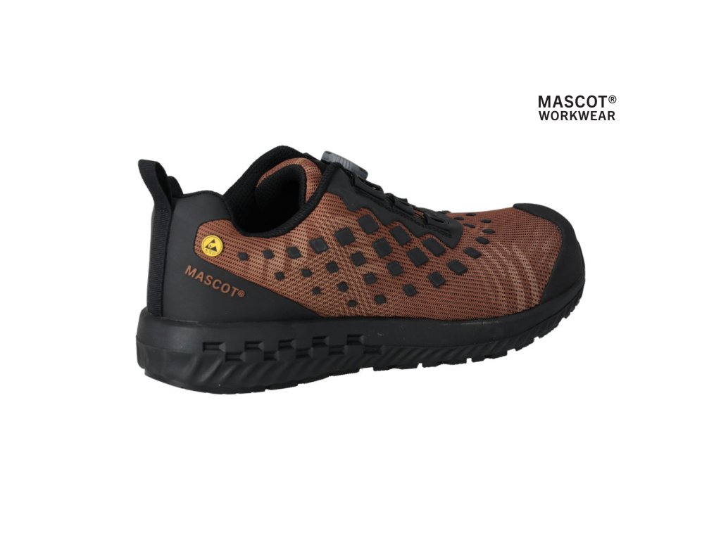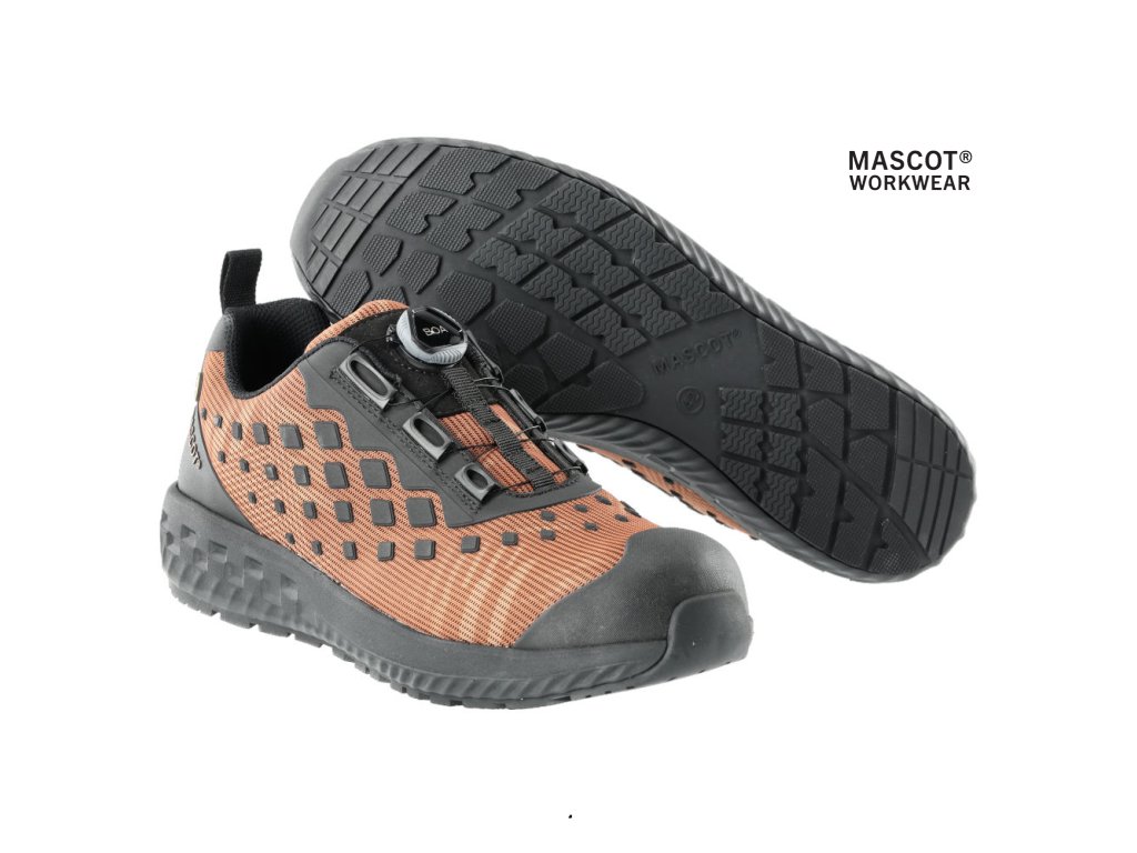 Hlavný materiál - polyamid. Predná časť topánky sa pružne ohýba spolu s chodidlom. Vonkajší materiál vyrobený z tkaniny odolnej proti opotrebovaniu. Priedušný vrchný materiál umožňuje ľahko odvádzať vlhkosť a teplo od chodidiel. Zapínanie a rozopínanie pomocou systému BOA® Fit, ktorý sa skladá z gombíka, šnúry a háčikov. Kompozitná špička. Ochrana proti prepichnutiu tkaniny MASCOLAYER®. Podrážka tlmiaca nárazy, mäkká a pružná. Vložky sú vymeniteľné. V medzipodrážke je Phylon vložka. Obuv je vhodná na prácu v kľačiacej polohe. Odolná podrážka je vyrobená z gumy s extrémnou protišmykovou odolnosťou. Podrážka odolná voči olejom a benzínu. Schválené podľa ESD, EN IEC 61340-4-3:2018, EN 61340-5-1:2016.