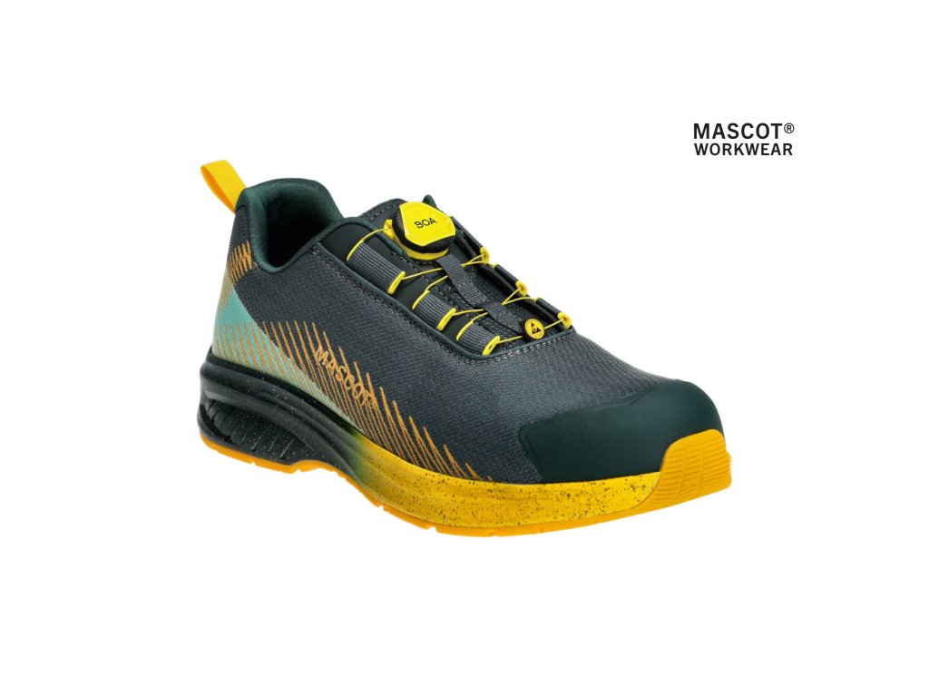 Hlavný materiál - textil. Predná časť topánky sa pružne ohýba spolu s chodidlom. Vonkajší materiál vyrobený z tkaniny odolnej proti opotrebovaniu. Zapínanie a rozopínanie pomocou systému BOA® Fit, ktorý sa skladá z gombíka, šnúry a háčikov. Kompozitná špička. Ochrana proti prepichnutiu tkaniny MASCOLAYER®. Vložky sú vymeniteľné. Ľahká, mäkká a pružná medzipodrážka EVA tlmiaca nárazy. TPU vystuženie päty. Vystuženie špičky z TPU. PU podrážka. Podrážka odolná voči olejom a benzínu. Schválené podľa ESD, EN IEC 61340-4-3:2018, EN 61340-5-1:2016.