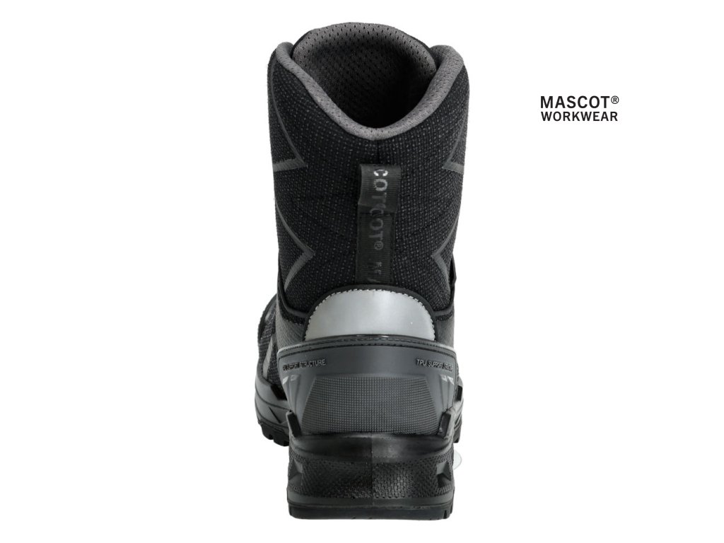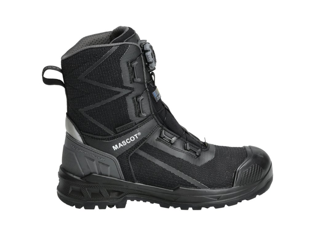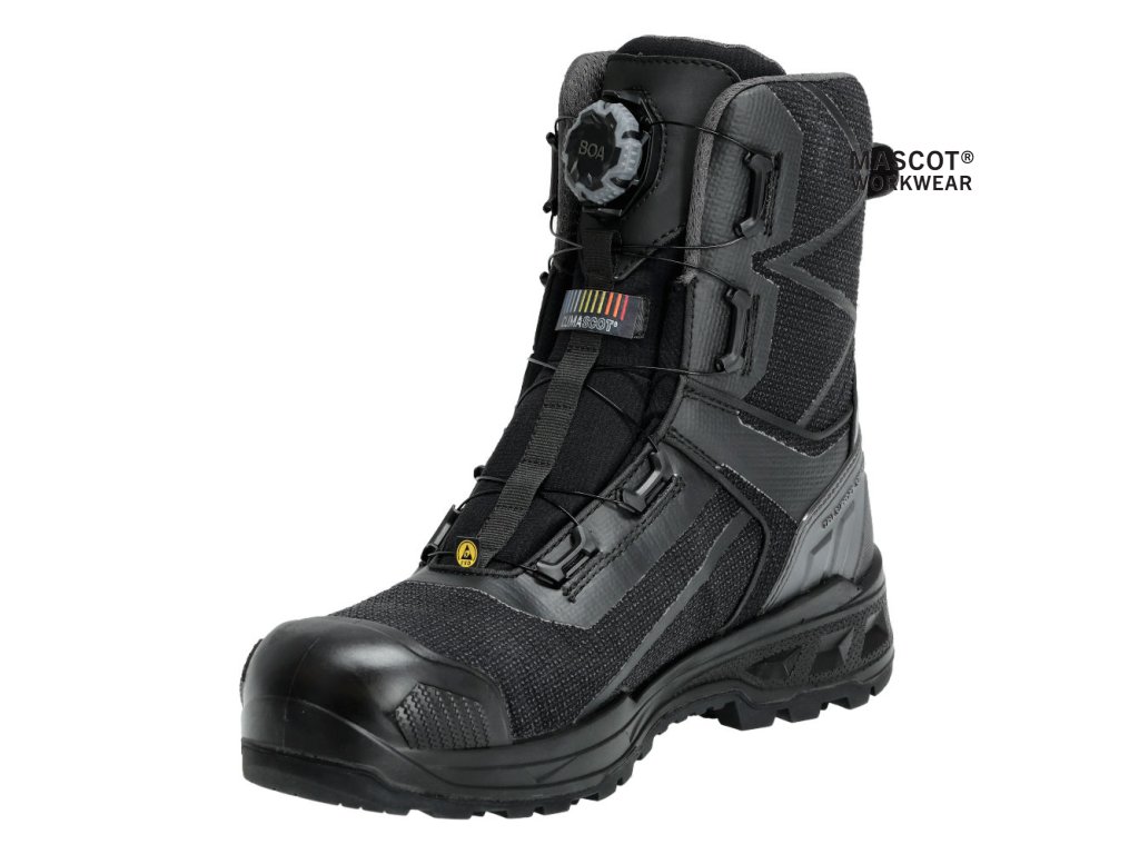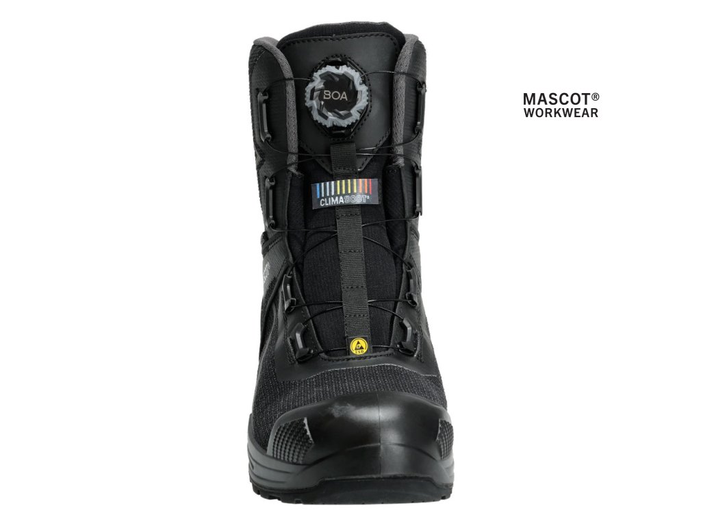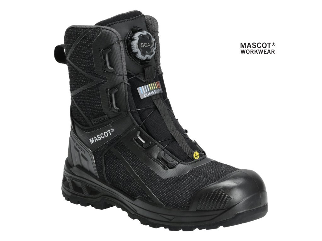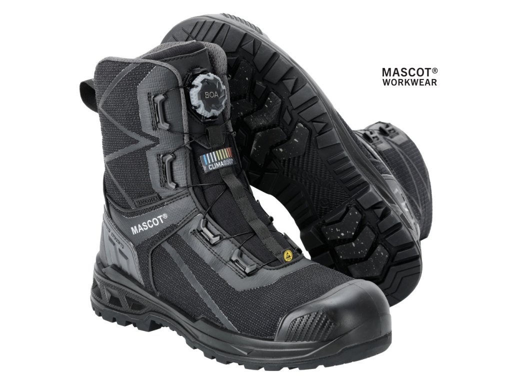 Hlavný materiál - polyamidový. Zapínanie a rozopínanie pomocou systému BOA® Fit, ktorý sa skladá z gombíka, šnúry a háčikov. Ergonomicky tvarovaná hliníková špička. Medzipodrážka z PU. Gumová podrážka s gumovými trecími vložkami. Odnímateľné vložky, antistatické a odolné. Absorbuje a odvádza vlhkosť. Tvarovaná výstuž špičky z TPU proti odieraniu. Podrážka je odolná voči olejom a benzínu. Tepelne odolná podrážka do kontaktného tepla 300 °C. Rebríková priľnavosť. Stielka tlmiaca nárazy. Izolačná vnútorná podšívka od Thinsulate™ Insulation. Nepremokavá membrána vyrobená z tkaniny MASCOTEX®. Vode odpudivý a priedušný vonkajší materiál. Sú vhodné aj na prácu v kľaku. Ochrana päty. ESD schválené podľa EN IEC 61340-4-3: 2018, EN 61340-5-1: 2016.