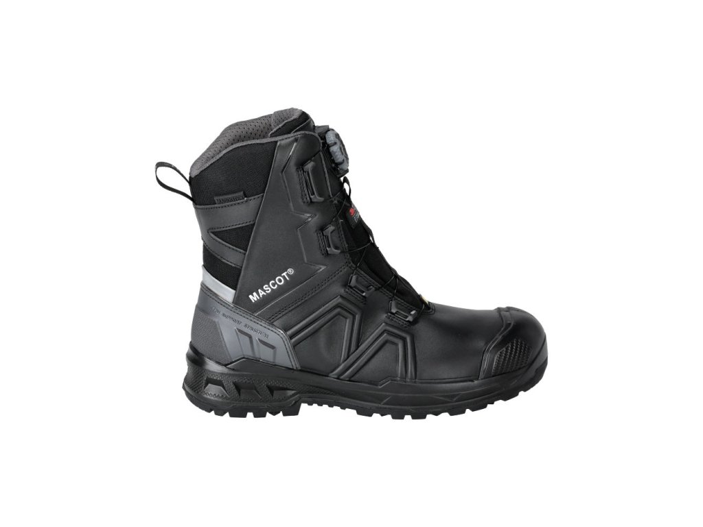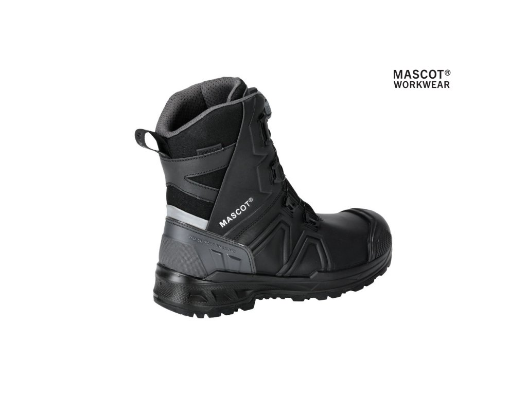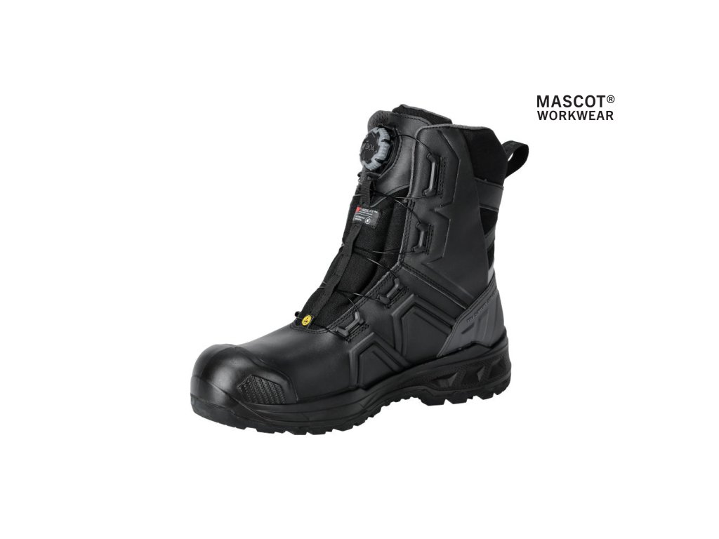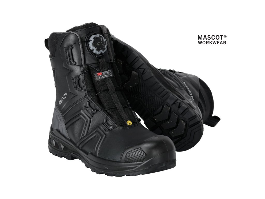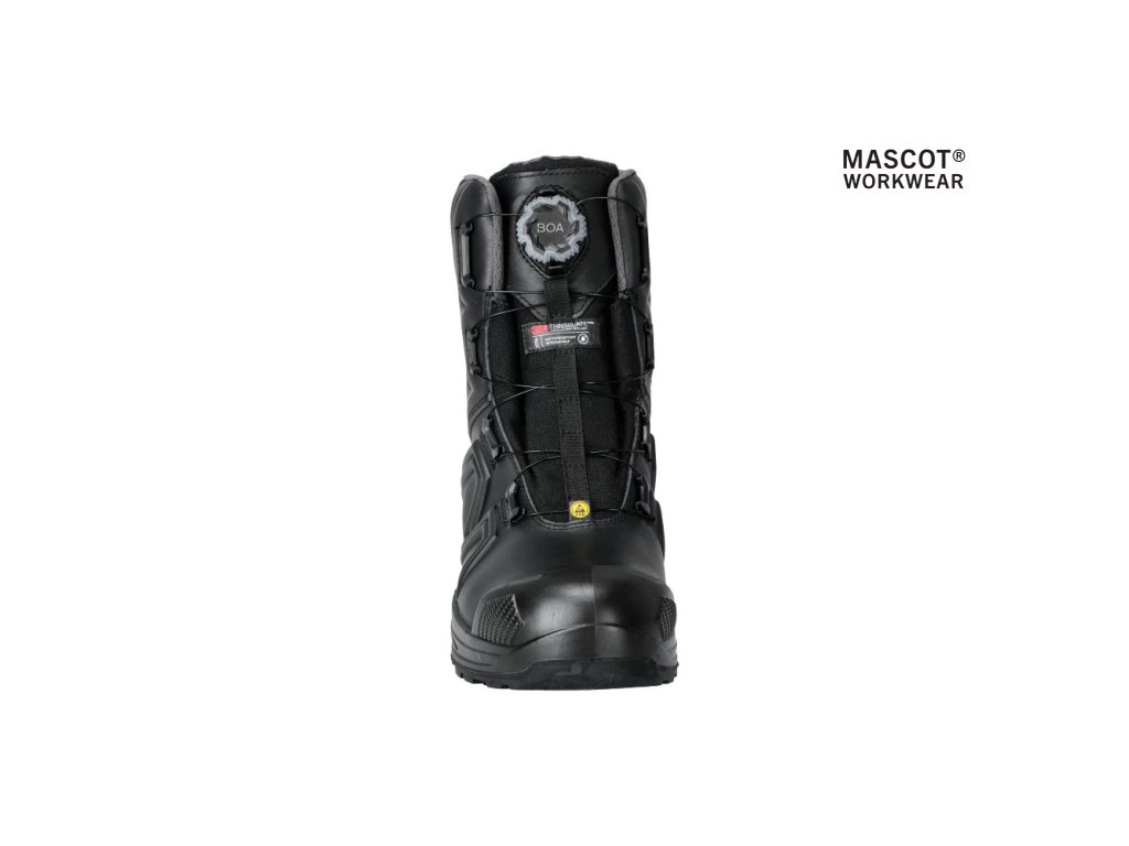 Hlavný materiál - celozrnná koža. Zapínanie a rozopínanie pomocou BOA® Fit System. Ergonomicky tvarovaná hliníková špička. Medzipodrážka z PU. Gumová podrážka s gumovými vložkami. Odnímateľné, odolné antistatické vložky. Účinne absorbuje a odvádza vlhkosť. Tvarovaná výstuž špičky z TPU proti odieraniu. Podrážka je odolná voči olejom a benzínu. Tepelne odolná podrážka do kontaktného tepla 300 °C. Rebríková priľnavosť. Stielka tlmiaca nárazy. Izolačná vložka Thinsulate™. Nepremokavá membrána vyrobená z látky MASCOTEX®. Nepremokavý a priedušný vonkajší materiál. Sú vhodné aj na prácu v kľaku. Ochrana päty. ESD schválené podľa EN IEC 61340-4-3: 2018, EN 61340-5-1: 2016.