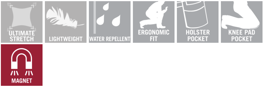 - Chrániče kolien, vyrobené z materiálu CORDURA® , ktoré sa natiahnu do dvoch smerov a poskytujú väčšiu voľnosť pohybu pri práci na kolenách.