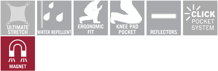 Extrémne elastická látka, ktorá je ľahká a veľmi odolná. Má vode odpudivý povrch. Pripravené na zavesenie vreciek pomocou Click Pocket Systém. Dvojité a trojité švy na nohách a v rozkroku. Ergonomicky tvarované nohavice. Pútka na opasok. Skrytý popruh na náradie. Predné vrecká. Zadné vrecká, jedno s chlopňou. Vrecko na pravítko vystužené látkou CORDURA® s malým vnútorným vreckom. Gombík (odnímateľný) na pripevnenie držiaka na nôž. Vrecko na stehne s vreckom na telefón s magnetickým zapínaním a integrovaným držiakom na doklad totožnosti. Odnímateľný držiak dokladu. Vrecká s chlopňou na prednej strane stehien. Nastaviteľné a vetrané podkolenné vrecká vyrobené z mimoriadne odolného materiálu CORDURA®. Jednoduché, individuálne nastavenie výšky kolenných vreciek. Nastaviteľné s patentkami na nohách. Reflexné prvky.