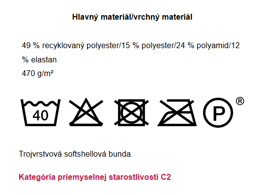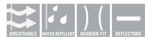 Elastická tkanina. Priedušná a vodeodolná. Moderný strih. Zapínanie na zips. Vysoký golier. Náprsné vrecko na zips. Predné vrecká na zips. Vnútorné vrecká. Odnímateľné puzdro na preukaz totožnosti. Elastický pás na manžetách. Reflexné prvky.