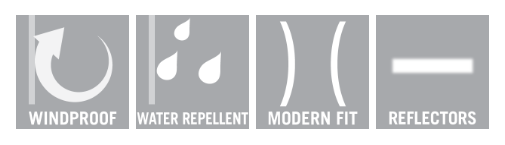 Priedušná, vetruodolná a vodeodolná. Moderný strih. Zapínanie na zips. Kapucňa. Predné vrecká na zips. Vnútorné vrecká. Guma na manžetách. Nastaviteľná elastická šnúrka v páse. Reflexné prvky.