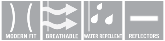 Moderný strih. Priedušné. Vode odpudivé. Ľahká izolácia CLIMASCOT®. Vysoký golier. Zapínanie na zips. Náprsné vrecko na zips. Predné vrecká na zips. Vnútorné vrecko. Elastický otvor na ramenách. Nastaviteľná elastická šnúrka v páse. Strečová tkanina po stranách a na hrudi. Reflektory.