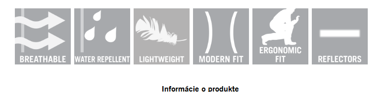 Prešívaná tkanina s elastickým materiálom. Priedušná a vodeodolná. Moderný strih. Vysoký golier. Zapínanie na zips. Vnútorné vrecko zo sieťoviny. Náprsné vrecko na zips. Predné vrecká na zips. Odnímateľné puzdro na preukaz totožnosti. Ergonomicky tvarované rukávy umožňujú veľkú voľnosť pohybu. Elastický pás na manžetách a v páse. Reflexné prvky. Súčasťou balenia sú lopty na sušenie v sušičke.