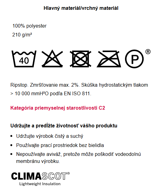 Ripstop tkanina v tejto bunde zabezpečuje vyššiu odolnosť proti pretrhnutiu – malé mriežky látky zastavujú šírenie trhlín a zároveň vďaka polyesteru zostáva materiál pevný a relatívne ľahký. Vysoký vodoodpudivý výkon s vodným stĺpcom nad 10 000 mm, potvrdený podľa normy EN ISO 811, robí bundu vhodnou aj do náročných poveternostných podmienok. Nízka zmršťovateľnosť (max. 2 %) zaručuje, že si bunda uchová svoj tvar aj po opakovanom praní.