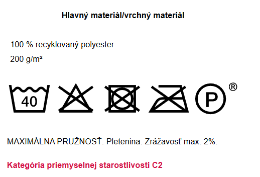 - Vysoký podiel recyklovaného polyesteru v primárnom materiáli.