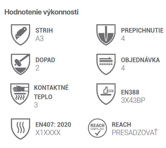 - Hodnotenia výkonu sú v súlade s normami ANSI/ISEA 105-2024 a ANSI/ISEA 138-2019